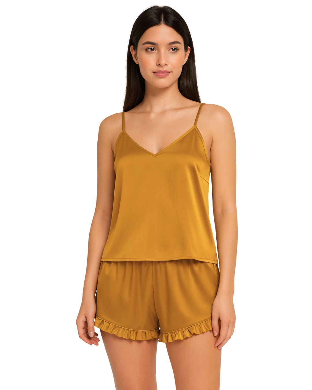 Crafted from ultra-soft, satin fabric, the set glides smoothly against your skin, offering unmatched comfort whether you're drifting off to sleep or lounging around in style. The cami top boasts a sleeveless cut with adjustable spaghetti straps, allowing for a custom fit that flatters every body type. Its gentle V-neckline enhances the neckline while keeping the overall look chic and refined.
